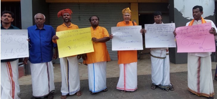 யாழ்ப்பாணம் இந்துக் கல்லூரி மைதானத்துக்கு அருகில் நேற்று ஞாயிற்றுக்கிழமை ஒன்று கூடிய சைவ அமைப்பின் பிரதிநிதிகள் குறித்த போராட்டத்தில் ஈடுபட்டன.