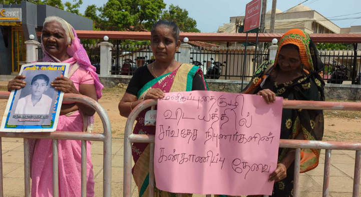முல்லைத்தீவு கொக்குத்தொடுவாய் பகுதியில் கண்டு பிடிக்கப்பட்ட மனித புதைகுழி அகழ்வு நடவடிக்கைகள் சர்வதேச கண்காணிப்பாளர்கள் அல்லது சர்வதேச நிபுணத்துவம் பெற்றவர்களை கொண்டு சர்வதேச நியமங்களுக்கு அமைய மேற்கொள்ளப்பட வேண்டும் என்பதை வலியுறுத்தி முல்லைத்தீவு மாவட்ட வலிந்து காணாமல் ஆக்கப்பட்டவர்களின் உறவினர்கள் முல்லைத்தீவு மாவட்ட செயலகம் முன்பாக நேற்று (12) கவனயீர்ப்பு போராட்டம் ஒன்றை முன்னெடுத்தனர்.