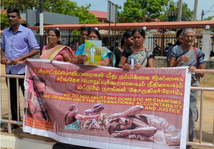 முல்லைத்தீவு கொக்குத்தொடுவாய் பகுதியில் கண்டு பிடிக்கப்பட்ட மனித புதைகுழி அகழ்வு நடவடிக்கைகள் சர்வதேச கண்காணிப்பாளர்கள் அல்லது சர்வதேச நிபுணத்துவம் பெற்றவர்களை கொண்டு சர்வதேச நியமங்களுக்கு அமைய மேற்கொள்ளப்பட வேண்டும் என்பதை வலியுறுத்தி முல்லைத்தீவு மாவட்ட வலிந்து காணாமல் ஆக்கப்பட்டவர்களின் உறவினர்கள் முல்லைத்தீவு மாவட்ட செயலகம் முன்பாக நேற்று (12) கவனயீர்ப்பு போராட்டம் ஒன்றை முன்னெடுத்தனர்.