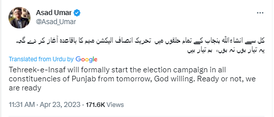 இதுதொடர்பாக அக்கட்சியின் பொதுச்செயலாளார் ஆசாத் உமர் தனது டுவிட்டரில், ‘தெஹ்ரீக்-இ-இன்சாப் தனது தேர்தல் பிரச்சாரத்தை நாளை (இன்று) உத்தியோகபூர்வமாக தொடங்க உள்ளது. அவர்கள் (பாகிஸ்தான் ஜனநாயக இயக்கம்) தயாராக இல்லாமல் இருக்கலாம் ஆனால் நாங்கள் தயாராக இருக்கிறோம்’ என்று அதில் அவர் பதிவிட்டுள்ளார்.