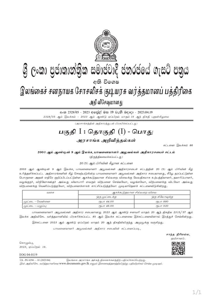 இவ்வாறு அறிவிக்கப்பட்டுள்ள விலைகளை விட அதிக விலைக்கு உற்பத்தியாளர்களோ , விநியோகத்தர்களோ அல்லது வியாபாரிகளோ விற்பனை செய்யவோ அல்லது காட்சிப்படுத்தவோ முடியாது என்றும் வர்த்தமானி அறிவித்தலில் தெரிவிக்கப்பட்டுள்ளது.
